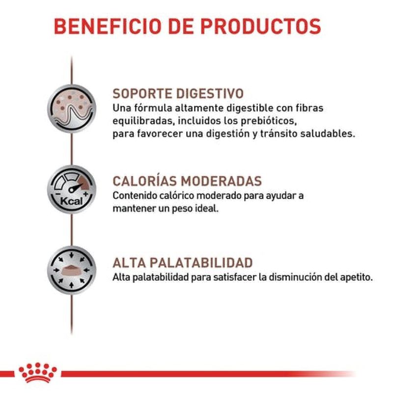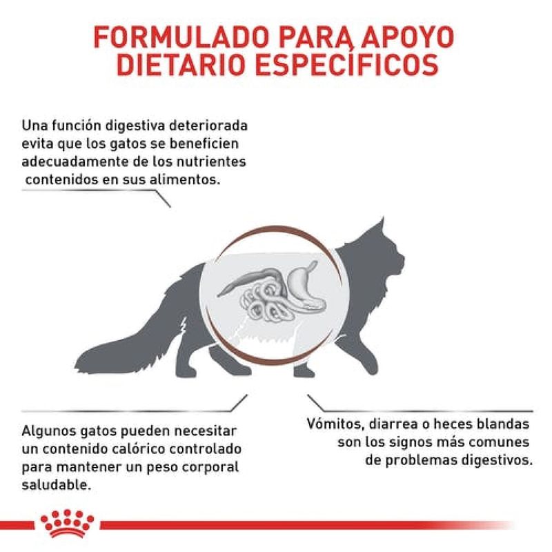 Es un alimento seco de la línea Veterinary Diets, formulado para gatos que sufren de trastornos digestivos agudos o crónicos, tales como vómito, diarrea, gastritis, enteritis, enfermedad inflamatoria intestinal o malabsorción. Su fórmula altamente digestible, enriquecida con fibras prebióticas y ácidos grasos esenciales, favorece la salud intestinal y la recuperación del equilibrio digestivo, garantizando el bienestar de tu gato.
